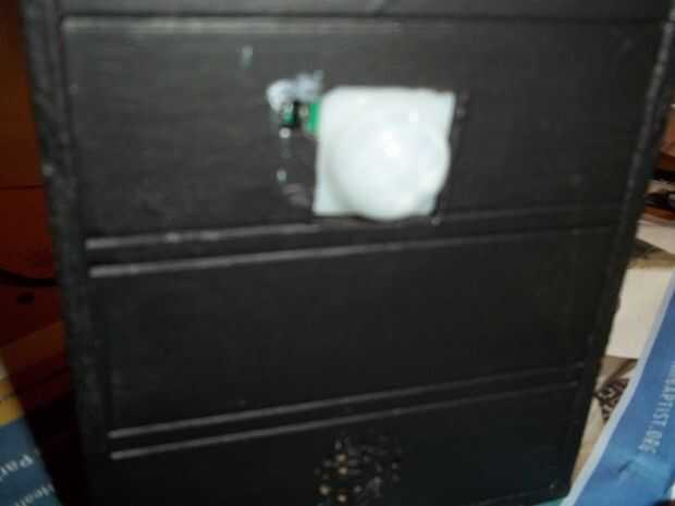 Ahora colocar el sensor PIR y pegamento caliente hacia abajo.