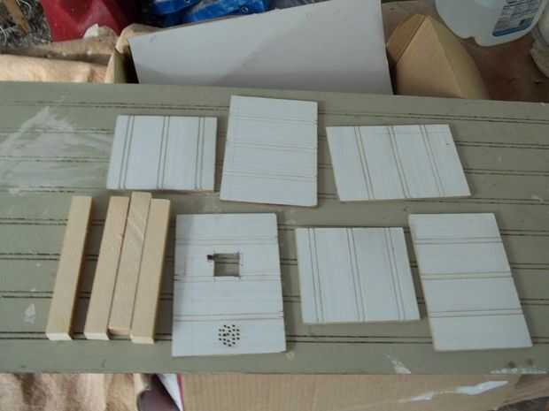 Cortar todas las piezas con una sierra eléctrica. Entonces, después de asegurarse de que encajan entre sí, lijar.