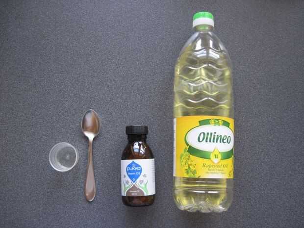 El aceite de Neem no debe aplicarse concentrado para la piel; sin embargo, es muy potente, así que un poco va un largo camino. Había diluido con aceite de colza como el tratamiento de Spot'n ir.
