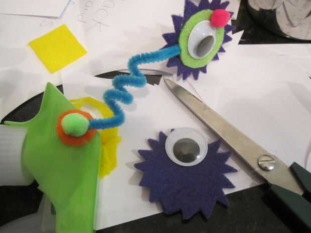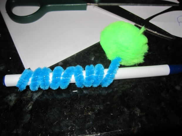 Limpiadores de pipa para hacer una cola y los ojos. Bolitas de hojaldre para la decoración adicional y ojos grandes de google.