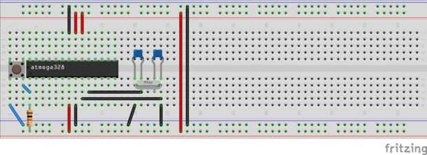 Básicamente un Arduino (ONU) se basa en el microcontrolador atMega328. Por lo tanto, se reunirán este microcontrolador en un protoboard con los componentes necesarios, excepto la interfaz USB. Siguen las fotos, diagrama y sus etiquetas que se muestra arriba para montar el Arduino en un protoboard.