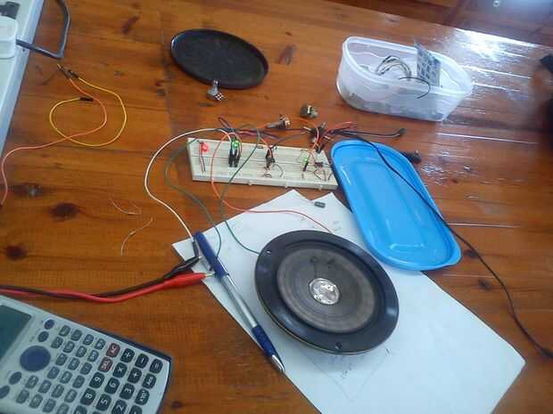Segundo: Conecte el circuito como se muestra en el esquema en protoboard y mostrar la salida del oscilador primero luego de la entrada y salida del amplificador. Revise el amplificador de forma de salida de frecuencia debe ser 22.000 KHZ menor que no será aceptable que también te darás cuenta que la onda cuadrada no precisa clara y esto es una desventaja de esta forma debido al efecto de la carga. utilizando causa altavoz grande carga altamente efecto usé distorsión más grande que el altavoz.
