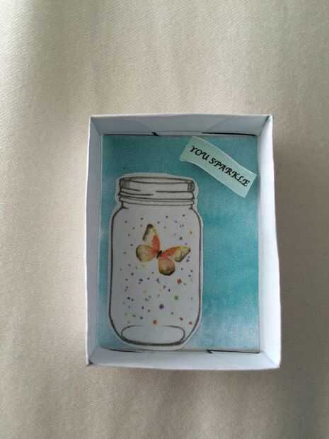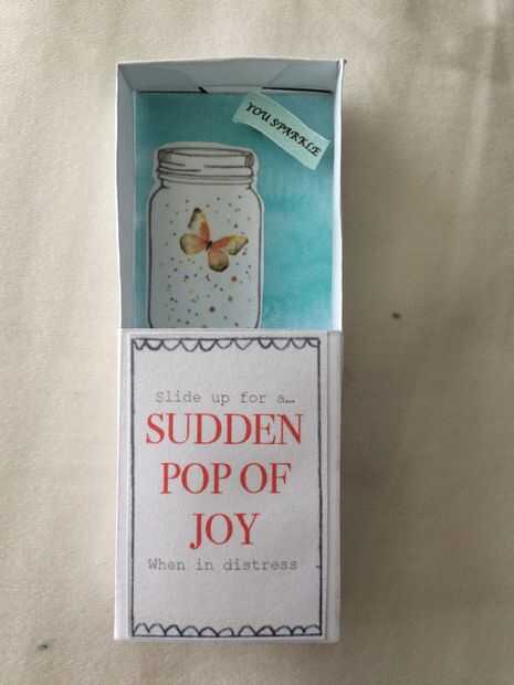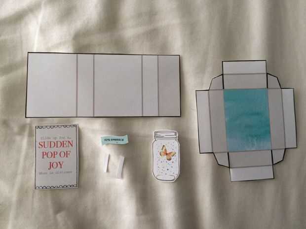 Corte etiqueta que chispa, caja acuarela azul, manga de caja, tarro de masón, etiqueta roja alegría y dos pequeñas tiras.