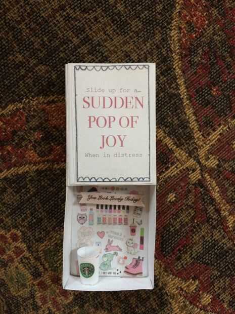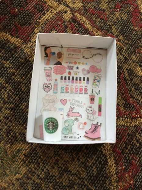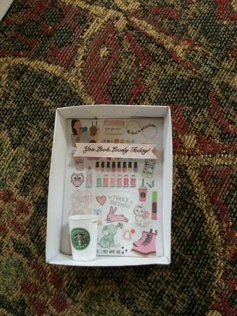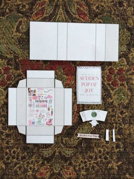 Cortar el cuadro de elementos de tumblr, manga de caja, etiqueta alegría rosa oscuro, taza de Starbucks, te ves hermosa hoy etiqueta y pequeñas tiras blancas.