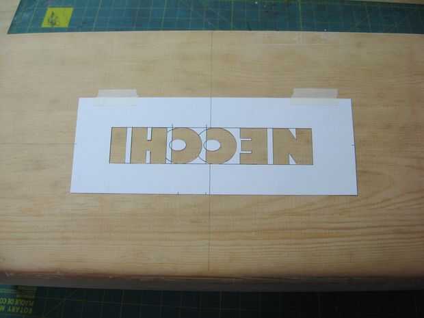 Comenzó trazando una plantilla sobre la superficie de madera y luego utiliza un cuchillo de la manía aguda para cortar a través de todas las líneas hechas con una plantilla a una profundidad de aproximadamente 1/16 de pulgada en la madera. Después cuidadosamente cepillado una mancha de luz en las áreas de la carta y borrado del colorante sobrante con un trapo. Esto se hizo en ambos lados de la caja.