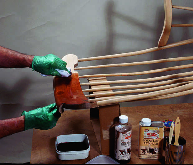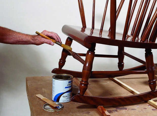 Para un acabado durable con sólo el brillo adecuado, terminamos nuestra silla mecedora con tres capas de hábil Semi-Gloss claro revestimiento de madera, aplicado siguiendo las instrucciones del fabricante (Foto 2).