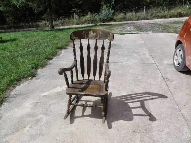 hace 5 años fui capaz de encontrar una antigua mecedora que era perfecta para una guardería de niños. Es madera oscura con un tema náutico y como se puede ver en la inicial cuadros al mismo tiempo que fue hermoso lamentablemente mi ex esposa lo guardó en una unidad de almacenamiento por varios años donde consiguió mojar y se convirtió en el estado en la segunda foto. Decir que el acabado fue en mala forma fue un eufemismo pero fue siendo mayormente sólido.