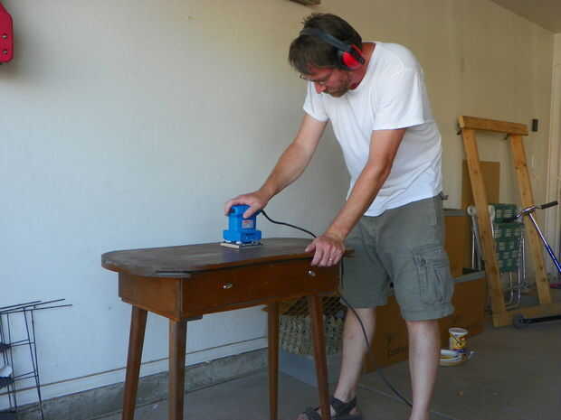 he utilizado diferentes tipos de lijadoras. La lijadora de banda trabajada mejor en las grandes superficies con grano 80, y luego lija la parte superior a mano utilizando grano 120. La lijadora de acabado trabajó bien en las áreas más pequeñas con grano de arena entonces 120 80. (ver video)