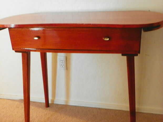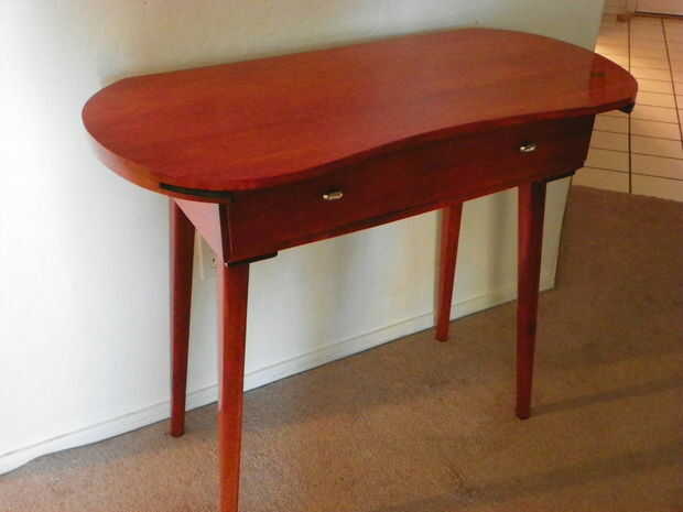 encontró una vieja mesa que debe haber tenido linóleo en la parte superior de una vez porque había orificios alrededor de la parte superior. Amaba la forma y el estilo y tenía un tiempo difícil decidir exactamente qué hacer. Después de lijar ligera