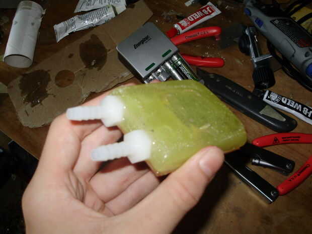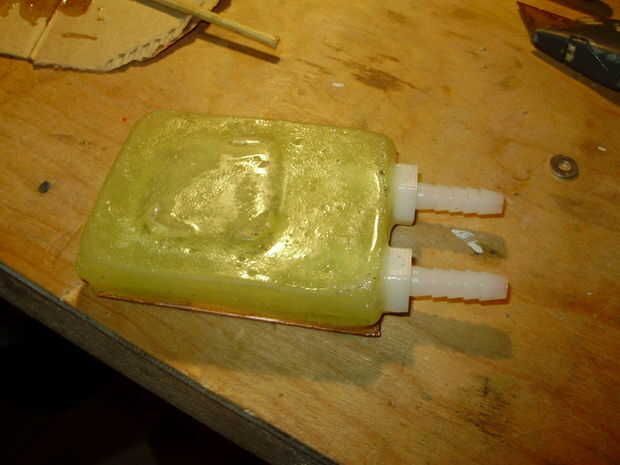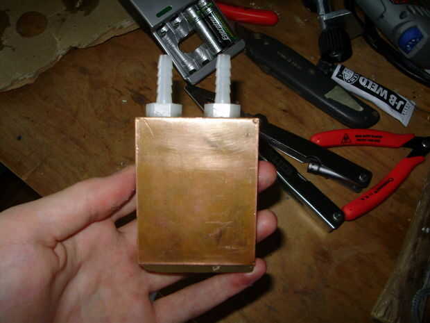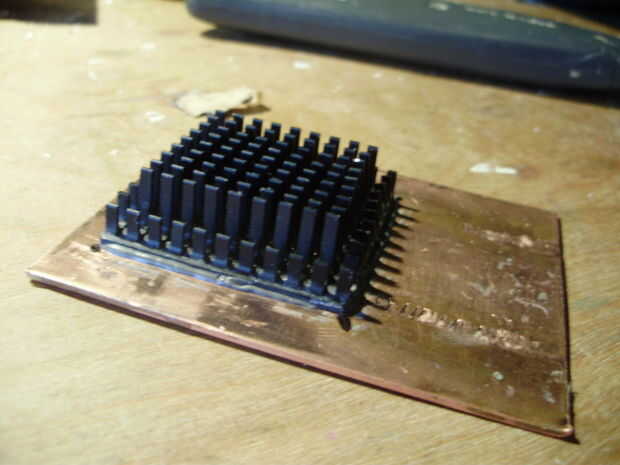 Ahora usted necesita alguna forma para el bloque de agua para retirar el calor de la CPU de la computadora. Encontrar una hoja de cobre de espesor 2mm y cortar al tamaño de la pieza de epoxy. Sólo las lisas de chapa de cobre no tienen mucha superficie, por lo que tendrá algo añadido a él. Utilicé un pequeño disipador de calor arrancó de un iMac Bondi Blue, pero funcionarían disipadores de northbridge o southbridge de la computadora la mayoría. Aplique pasta térmica en la base del disipador de calor, extendió un anillo de J B soldadura alrededor de la base y sujete en el lugar apropiado en la hoja de cobre. Rayado hasta los bordes de la cara frontal del cobre con un papel de lija y luego unir las dos mitades de la bloque.