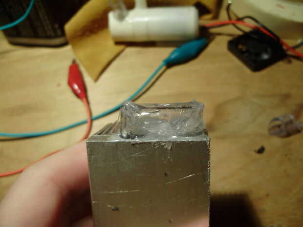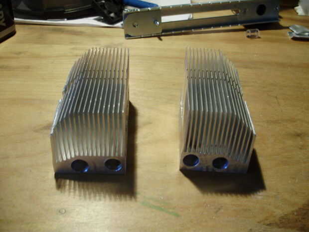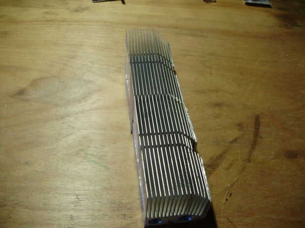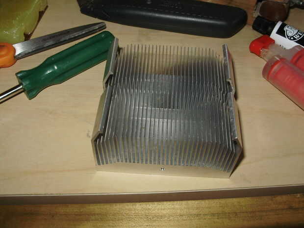 El radiador es la pieza del circuito de refrigeración por agua que transfiere el calor del agua al aire. Radiadores más que comprar son bastante cuadrados en forma, por lo que no encajaría bien en un portátil, y sus aletas son demasiado de cerca espaciadas para que trabajen bien pasivamente. Vas a necesitar construir su propio radiador. Debido a su forma, los disipadores AMD stock son perfectas para esto. Con una prensa de eneldo, taladro 4 agujeros uniformemente espaciados de 5/16 de pulgada a través de la base del disipador de calor y entonces vio el disipador de calor en la mitad con una sierra para metales. Utilizando soldadura de J B, pegue las dos mitades del disipador de calor extremo a extremo para alinean los orificios. Para hacer un giro en un extremo del radiador, insertar dos 1 pulgada pedazos del tubo en los agujeros, con sus extremos cortan en ángulos de 45 grados. Cortar un pedazo de tubo, con ambos extremos en ángulos de 45 grados y péguelo entre los dos bits que sobresale del tubo para conectarlos.