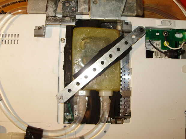 Empezar por montar el radiador con los accesorios pegados en el. Luego llene la bomba en la ranura de la batería. El bloque será un poco más complicado. Primero aplicar algunas pasta térmica a la CPU. Espuma densa de materia alrededor de la manzana para evitar que si moviendo de lado a lado. Para mantenerlo hacia abajo, atornillar una pieza de un Erector set diagonalmente a través de él entre dos orificios en la parte inferior de la computadora portátil. Pegar el tubo a la parte inferior. Luego alambre de los cables de la bomba de dos a los dos cables USB.