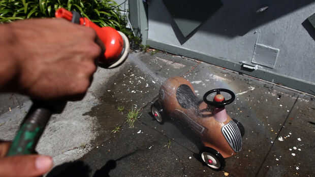 La pintura se adhiera a la superficie, se desea que sea agradable y limpio. Así que por ahí con una manguera y jabón y frote hacia abajo. A continuación dejo secar.