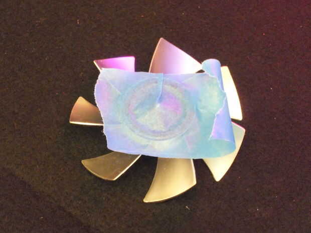 EL VENTILADOR SIGUIENTE COLOQUE UN CUADRADO DE CINTA SOBRE EL ÁREA CIRCULAR DEL EJE DEL VENTILADOR, Y PALILLO BIEN ABAJO, NO EMPUJE LA CINTA A TRAVÉS DEL EJE, SOLO DEJA UNA PEQUEÑA MONTAÑA EN EL CENTRO (COMO SE MUESTRA)