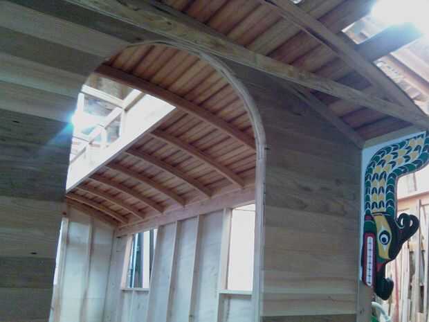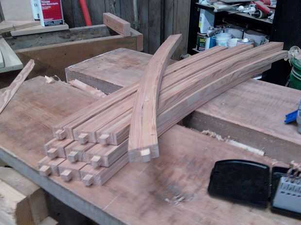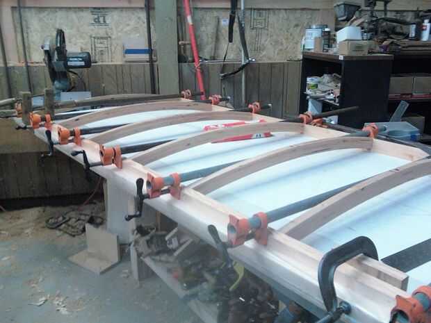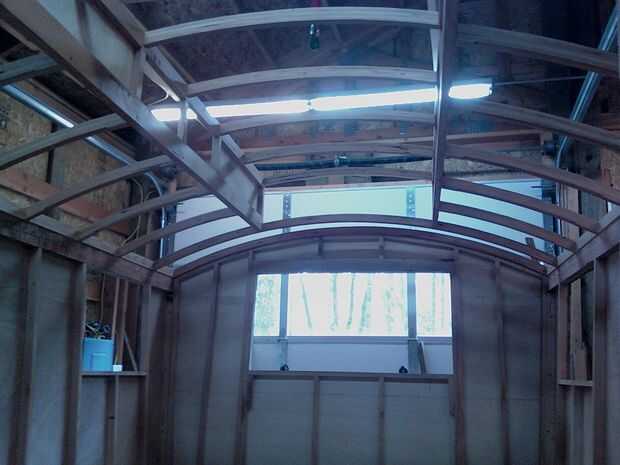 Ya que quería incluir una mollycroft, tuve que cortar 6 de los 10 pegamento lams en tercios. Asumió un compromiso! Encuadre para el mollycroft arriba fue pegado por separado y se instala como una Asamblea. Juntas de grano fueron instalados con tornillos de acero inoxidable. Se ven muy agradables desde el interior. El espaciado de las glu-lams es igual a la anchura de los paneles para techos porque quería poder atornillar el hardware del techo con tornillos largos las vigas y no sólo las bolas de la Junta. El refuerzo horizontal en la última foto fue utilizado para sostener la viga larga duración a la curva correcta (recuerda, que surgieron nuevamente un poco de pegamento después). Esto no era necesario para los más cortos asociados con la mollycroft.