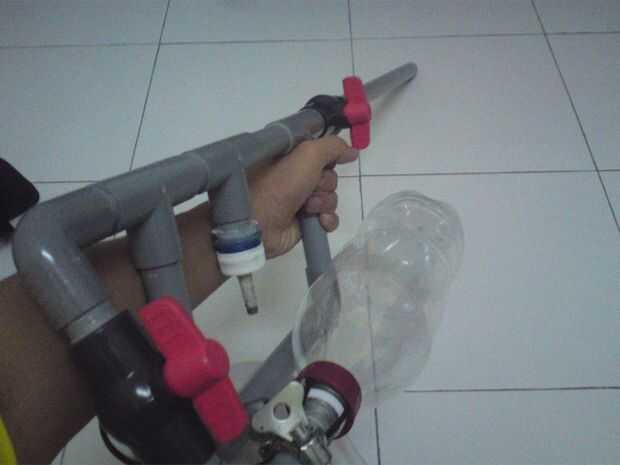 Operación: después de disparar con la válvula de disparo. abres otra válvula para que la presión de aire en el depósito se puede llenar en la cámara. por lo que se puede disparar otra vez.