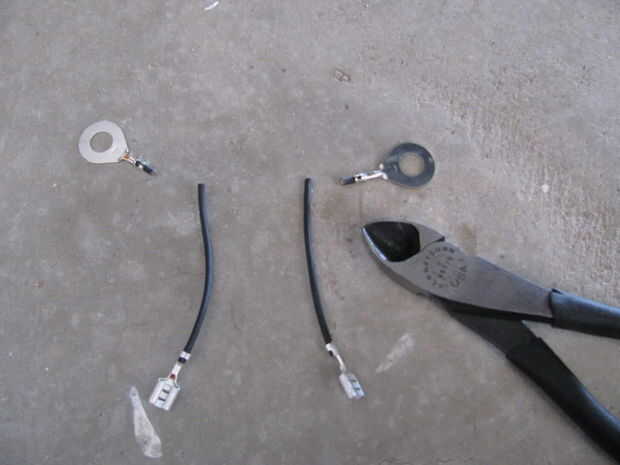 Pele los extremos de los cables y los conectores de corte en los extremos de la encrespadura. Cable rojo es el positivo, cable negro es negativo. No te preocupes, no choque a ti mismo aquí, alguien tendría que tocar la bocina mientras se cachondeo con los cables para tratar de hacer cualquier cosa. Ahora para un pequeño truco. Las piezas cortas en esta foto vienen con los cuernos. Corte como se muestra. Con los golpecitos del alambre, poner el cable OEM en el paso a través de la ranura de la llave, cerca de 4 pulgadas desde el extremo y los cables corte en el último paso en el otro lado de la llave. Buscar en los grifos, usted podrá entender fácilmente. Apriete los contactos de la llave y luego empuje las tapas sobre ella cuando haya terminado. Al final debe verse así...