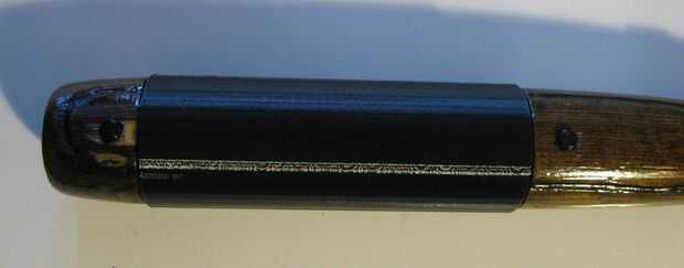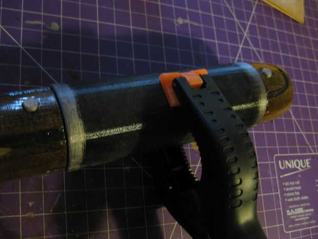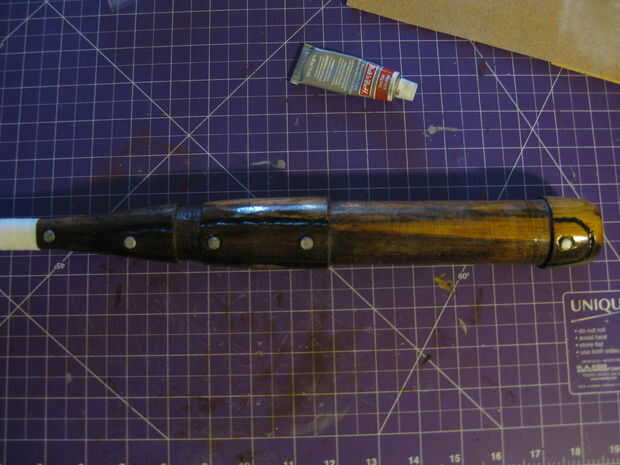 -Aplique un pegote de pegamento loco a dos lados de un refuerzo y ponerlo en el palo, lo mejor es girar la pieza un poco como va a extender el pegamento alrededor, asegúrese de que se pega para arriba de alrededor de 1 mm a cada lado del palo.