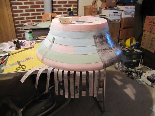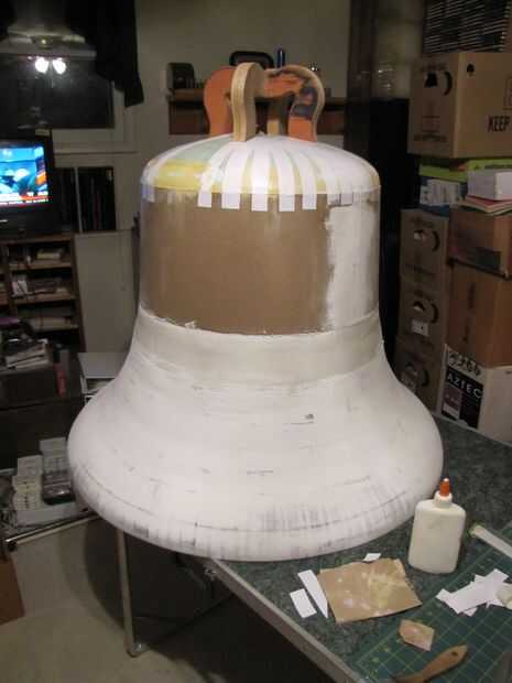 Nota: Las piernas de la corona original extendido por el XPS para que puedan fijarse en el disco de madera mediante tornillos a través de la parte inferior de la campana. Había revisado esta configuración cuando barnizadas la campana. El bloqueo en las representaciones en el paso 4 se asocia con la corona revisada.
