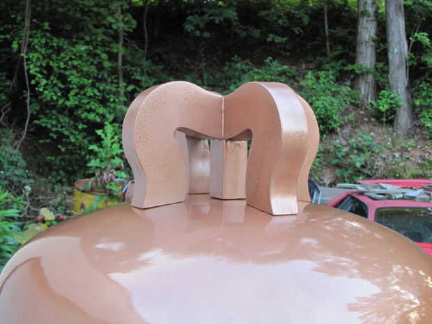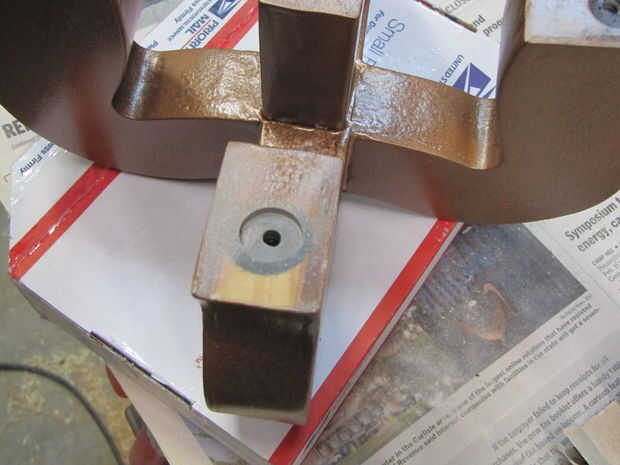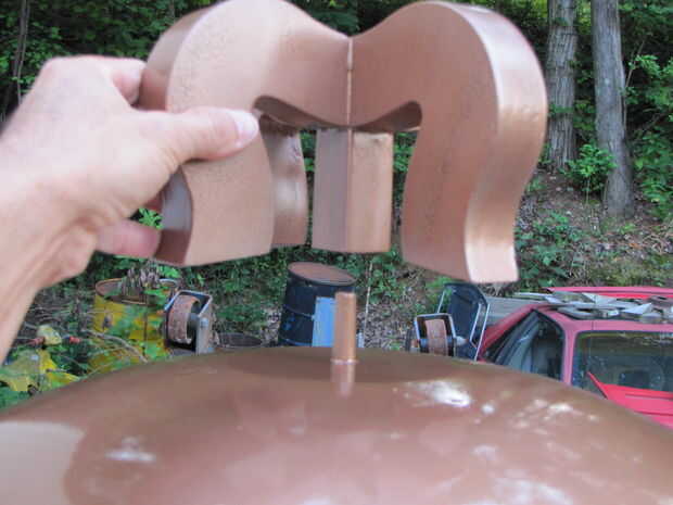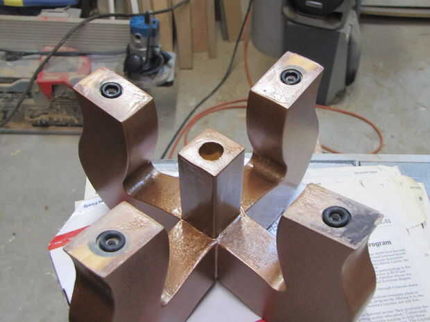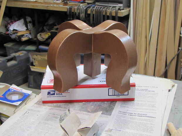 Las nuevas secciones de corona están hechas de una capa de clara pino laminado entre dos capas de madera contrachapada de ¼" de ¾". En agujeros, me perforaron agujeros de gran tamaño y había llenado con resina de poliéster. Entonces cubrió la corona toda con resina. Después de endurecida la resina, utilicé una broca Forstener molino hendiduras en las ubicaciones de los tornillos para permitir O-rings que sellar la unión entre la corona y la parte superior de la campana.