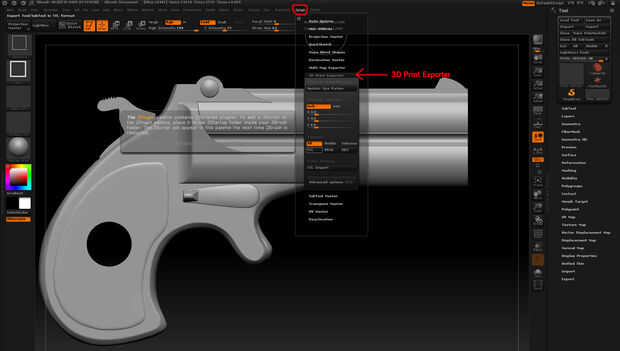 El 3er paso de este proceso fue exportar el modelo en un programa de catalizador que permite la pistola ser impreso en un modelo psíquico. ZBrush hace que este paso sea extremadamente fácil. Hay un comando de impresión exportador 3d construido directamente en zbrush como un zplugin permitiendo para el apresto del modelo como una exportación de archivo STL haciendo el archivo una estereolitografía.