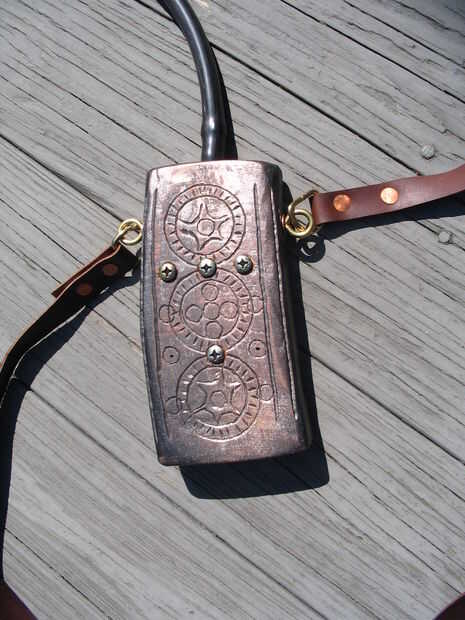 Corté una correa de cuero que compré, pero puede usar una correa larga u otra correa. La correa de cuero estaba asegurada para el anillo en D de latón con remaches de cobre (valor verdadero hardware store) y el anillo en D fue conectado a una latón gancho de ojo jodido int el lado de la madera.