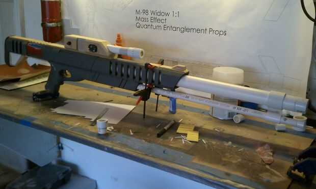Una vez ambos barriles un acoplador que se deslizó sobre ellos fácilmente, corte y pegado un pedazo de acrílico 1/4" entre ellos para mantener los barriles paralelos. El cañón principal tenía un 1-1/4" a 3/4 antideslizante adaptador pegado al final de la misma para hacer las paredes del cañón se vea más grueso. El bajo cañón tiene un pedazo de estireno pegado hasta el final para colmo. Todas las conexiones se lija suave y la pieza de conexión del acoplador/acrílico fue pegada en lugar.