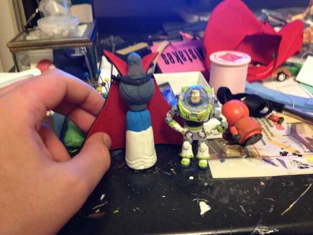 La base fue esculpida con tiempo y paciencia. Con alguna referencia a un lado a mí moldean la base. Tuve que ampliar la pieza inferior porque estaba un poco preocupada de que él sería demasiado corta para zumbido así que hice una pequeña expansión. Sus ruedas en la parte inferior eran un dolor en el pero. Usé las ruedas desde el más pequeño tech deck patineta pude encontrar afeitado la parte inferior de su base para sus ruedas las ruedas traseras fueron fáciles. Pero la rueda delantera era un reto porque cuando estaba tratando de pegar en su lugar, se atascó. Me tomó un tiempo para aflojar la rueda otra vez a rodar. El cabo es de espuma negra y un calcetín de libro rojo pegadas. He encontrado una foto del cabo de Zurg para utilizar como una plantilla para la forma de su capa. Pulsa el cuchillo suavemente en la espuma para dar los detalles que tiene en su capa. Escultura de la parte superior de zurg de cargas de imágenes de referencia para el pecho y la cara. Tuve que ser muy cuidadoso cuando me moldeo por el pecho porque quería hacerlo realmente perfecto para la película. La cabeza es articulada de una muñeca de una figura de hierro hombre mega bloques y la estructura inferior es articulada por la parte de la pierna del hombre de hierro para la cintura. No doble la cintura como de buzz porque no tengo suficiente juntas para todos los personajes que tienen este tipo de articulación. La cara era bastante difícil porque quería todo en 3-d del molde del molde. Incluso le dio una visión de zurg o como en la película pero no está allí para la decoración como la transmisora y la parte posterior. La parte superior de la capa alrededor del cuello se hace de los mismos materiales de la otra parte del cabo. Sólo éste se acurrucó como la película.