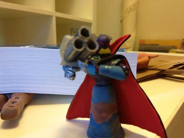 El blaster es hecha a mano de cartón, chapa, cinta adhesiva y alambre. He creado unas plantillas para la forma de blaster de Zurg incluyendo el mango. También la posición de pulgar de su mano derecha tuvo que ser cambiada para sostener la pistola. La parte superior de la pistola fue moldeada en arcilla Craylola. Un agujero se asomó en la pieza para sujetar el tubo. Pegué todo con pegamento loco. El blaster es extraíble. La parte trasera que sujetan todas las bolas amarillas de Zurg en se crea a partir de cartón y una tapa de la botella. Las bolas son sólo tapas de pernos de coser los amarillo. La parte más difícil fue hacer las columnas de la vuelta simétrica.