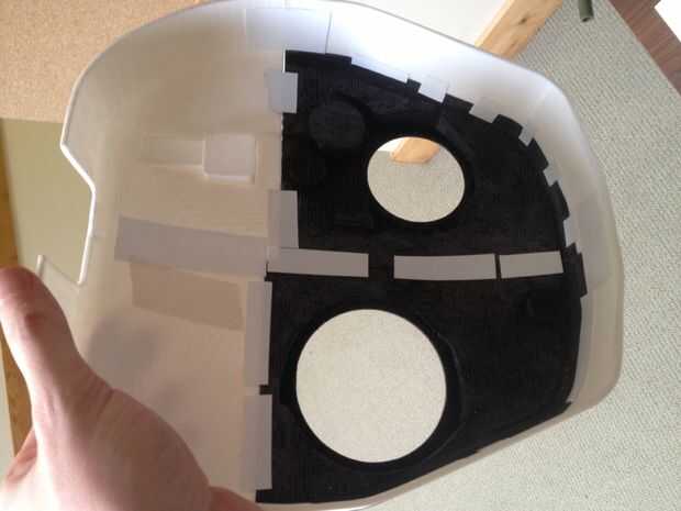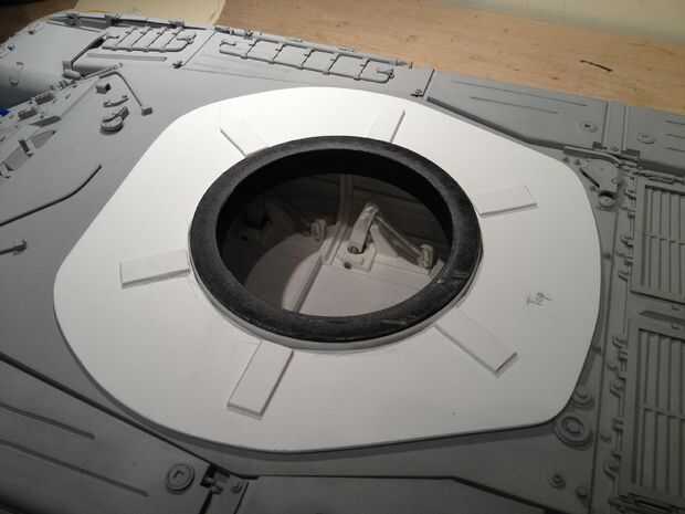 A continuación construí la placa inferior de la cáscara para sentarse. La placa es básicamente un pedazo de lámina de plástico con un anillo impreso en el medio. Eso anillo impreso encaja perfectamente en el anillo que pusimos en la parte superior del casco. La imagen final muestra la concha preparada en nuestro casco de tanque detallada (hay unos pedacitos de detalle en la carcasa... Yo no podía ayudar a mí).