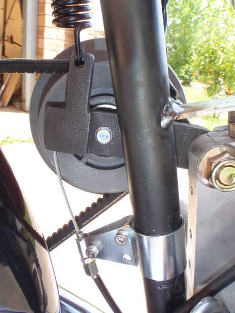 Ahora! Donde no estoy totalmente de acuerdo con muchos es el sistema usado para ajustar las correas. Retire la correa trasera de la polea trasera y el cinturón delantero y ajuste del embrague. Empiezo haciendo la correa delantera "Apretado"; Luego ajustar el cable para que la palanca del embrague provoca el cinturón a aflojar cuando tiró y apretado cuando se libera. Después de hacer el cinturón delantero funciona correctamente después de todo es la responsable de la acción de embrague correa], luego instalo la correa trasera. Si es demasiado flojo el cinturón trasero, muevo la rueda hacia la parte posterior [a veces la cadena de la bicicleta puede necesitar un media-link] hasta que aparezca la polea de embrague comienza a moverse hacia abajo, apriete de la rueda. Si la correa está demasiado apretada, que muevo la rueda trasera hacia adelante, si la cadena de la bici es demasiado floja puede aflojar el perno de montaje del motor trasero superior y empuje ligeramente hacia delante la parte superior del motor y apriete el perno.