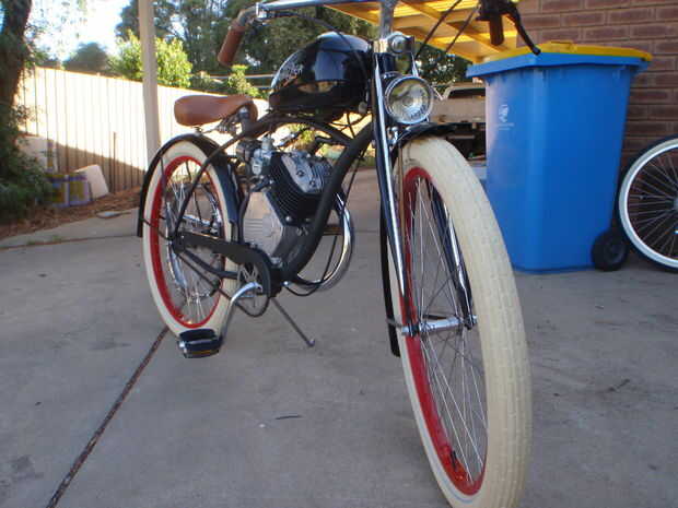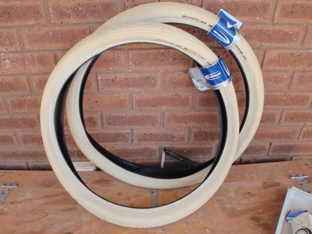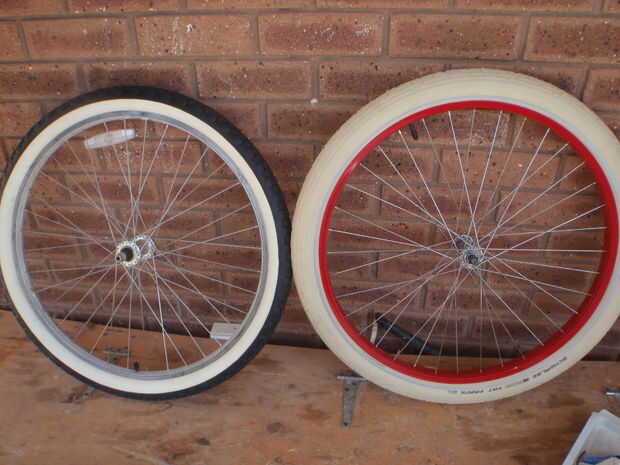 y pude ver a un par de neumáticos blanco llano 26 x 2.35 que un poco más como algo de la década de 1920 el neumático también son bastante más grande que los whitewalls 26 x 2.125 y hacer la moto mirada más auténtica.