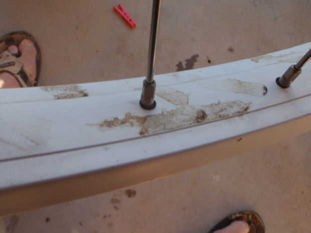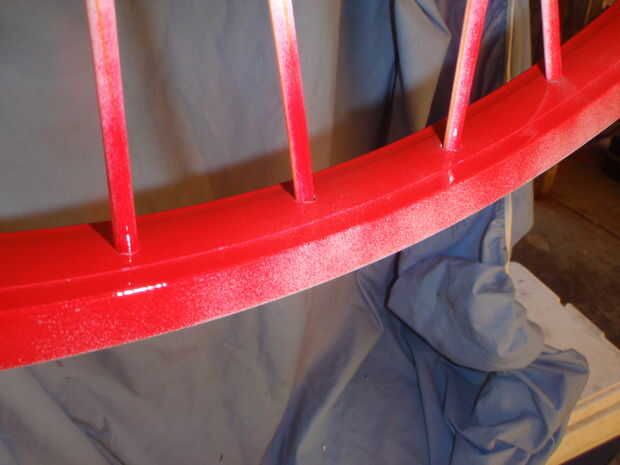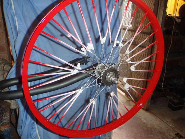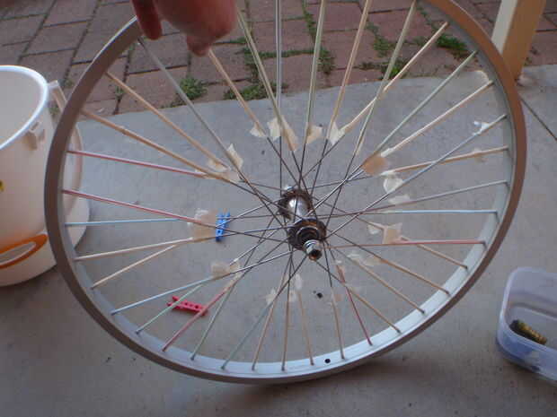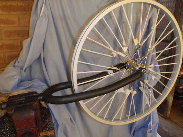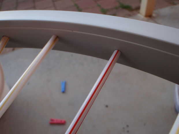 Ive utiliza cinta adhesiva rayos antes y el resultado no es muy bueno y la cinta es casi imposible sacar los radios luego. Limpia y lija los bordes luego equipadas la paja a los rayos. Una pequeña cinta sujeta la paja. Luego usé la horquilla vieja para sujetar la rueda mientras que ha pintado. He utilizado la mejor pintura de calidad que podría comprar en una lata de spray y lo pagó, como la pintura salió brillantemente. No se deje engañar en la compra de esa pintura barata de $2 es una mierda absoluta.