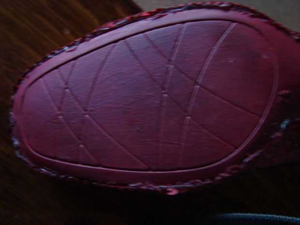 Extendió el periódico sobre su superficie para evitar manchas. Luego, utilizando el pincel, pintar ambos zapatos, (excepto adentro) incluyendo el fondo y dejar secar. Añadir una segunda capa.