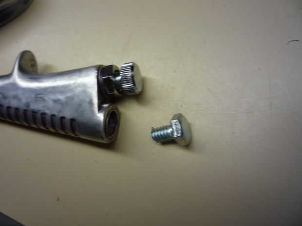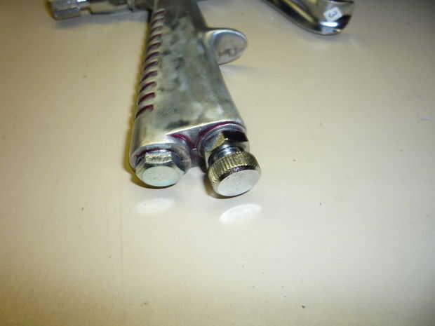 usted también notará en la parte inferior de la pistola hay dos agujeros... el uno hacia el frente puede tener la pieza con la perilla ajustable re instalado... como para la parte de atrás hice un tornillo, corte corto llenó el agujero con pegamento caliente y coloque el perno, le dio un aspecto más acabado.