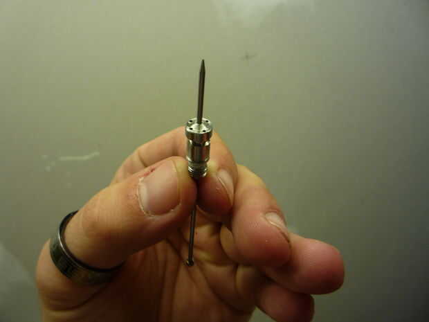 ahora la boquilla de darle la vuelta para que está buscando en su interior con la rosca hacia usted y la aguja firmemente en su lugar y llenar el interior del pulverizador con pegamento caliente para fijar la aguja imperdible.