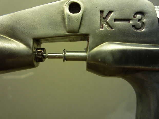 una tomó un pequeño remache pop y deslizar la parte de post en la varilla que inserta en la última parada, esto evitará que el gatillo zangoloteo alrededor y haciendo ruido. no hay necesidad para pegar esta pieza, como el gatillo y la tensión del resorte serán mantener en su lugar.