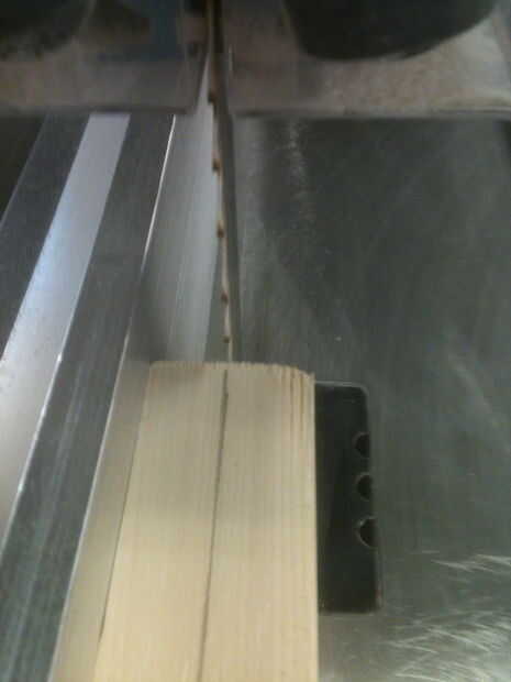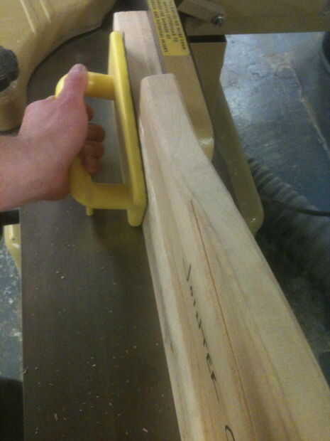 Marque el centro de cada tablero a lo largo de una arista, una línea que marque con una hoja de Sierra de cinta ancha y tire la valla derecha contra la Junta. Estos tableros son cada vez más difíciles de sostener a través de una hoja, y accidentes de la Sierra de cinta puede ser scaary, así que utilice varas para empujar la Junta contra la guía y empuje a través de la hoja. Lo que con todas las tablas y plano de las caras de bandsawn, en secuencia como antes, mantener todo incluso.