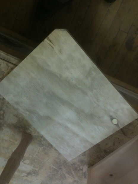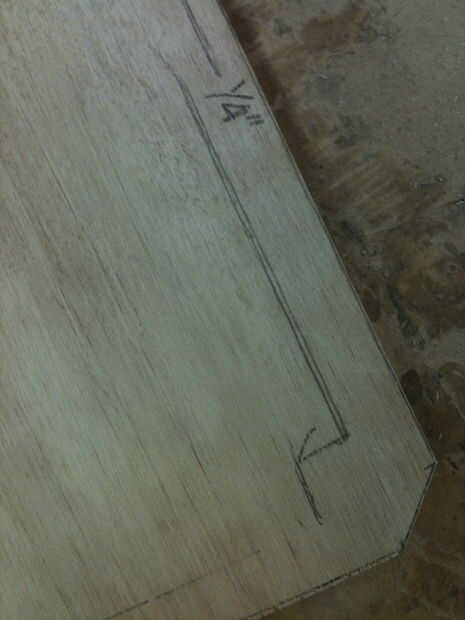 Poner el taburete boca abajo encima de tu pieza [imagen 2]y marca alrededor de los bordes exteriores de las heces y cortado a la medida. Me corte mi en ángulos de 45 grados por lo que solo te cubren la mitad de las piernas. No quiero esconder las piernas una vez el cojín en el asiento, para que superposición dará soporte del asiento, además de un marco para el colchón y la tela.