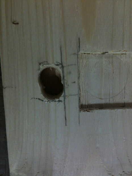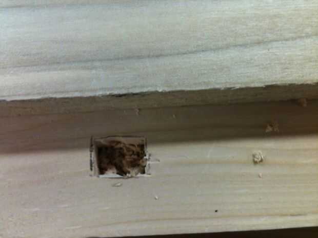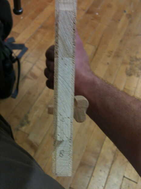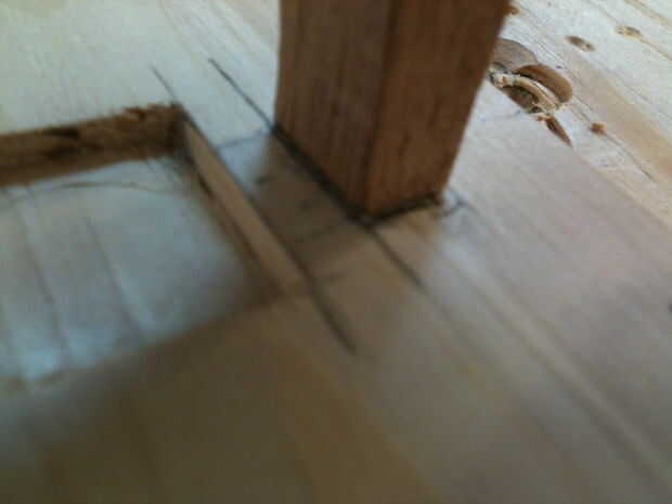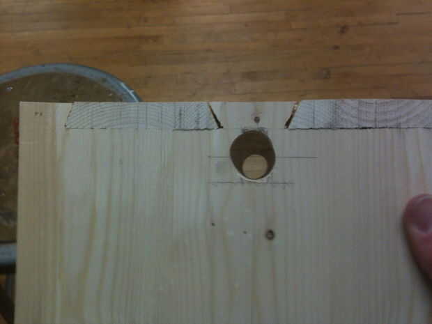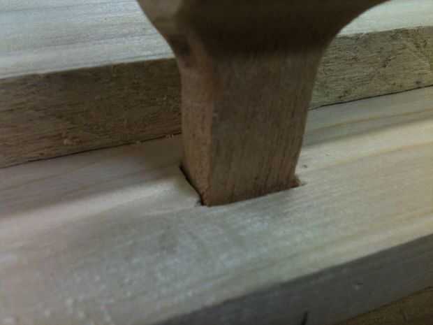 Seguimiento de las clavijas en los paneles de 1/2"- 1" por debajo de las ranuras, 1-2" sobre los bordes inferiores. Perforar y terminarlos con un cincel, a lo que las formas de peg son [imágenes 6-8]. Asegúrese de que se pegan hacia fuera maneras en lo que será el interior de las heces, que necesitan para apoyar la caja interna y su peso sea funcional.