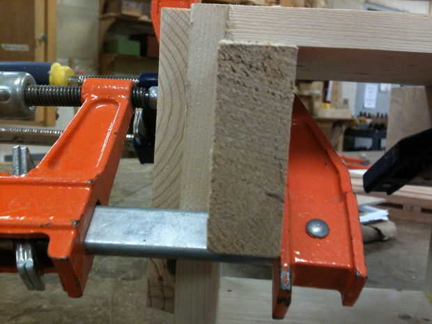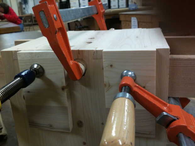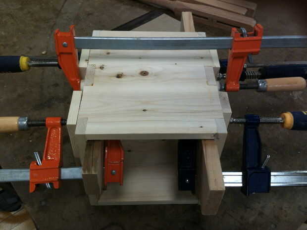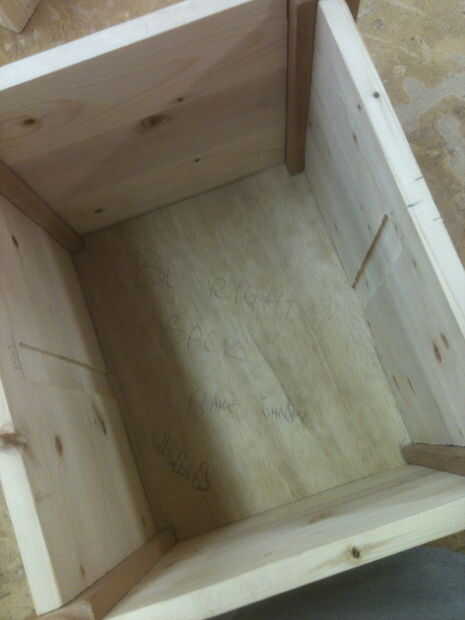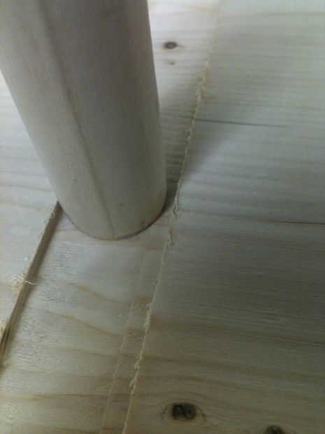 Antes de taladrar, hice el asiento, poner boca abajo el taburete en con la caja interna dentro y marcada de sus bordes inferiores a averiguar donde los agujeros de la peg de parada deben ser. Recomiendo hacerlo.