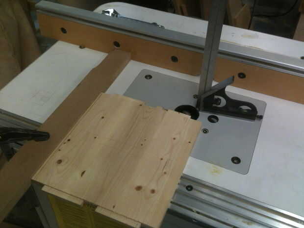 Porque mi panel era sólo 1/2" de espesor, mi surco era solamente 1/8" de profundidad. Podría probablemente ser más profundo, pero no quería debilitar ésos 2x4s. Dependiendo de sus materiales y la cantidad de peso en la caja interna, podría elegir algo diferente. Ejecutar los dos paneles, extremos contra la guía, a través del router (fije la altura de la broca y profundidad primero!) para hacer la ranura. No es realmente necesario, pero al cuadrado por el extremo de las ranuras con un cincel [imagen 9].