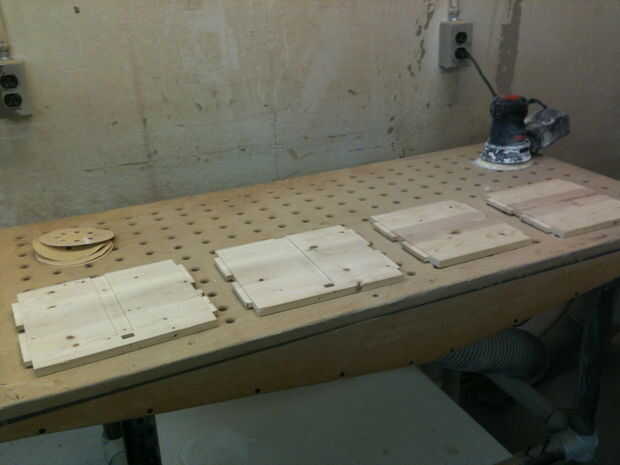 Básicamente queremos todo limpio, liso y fácil de usar antes de que consigue pegado.  Lijar cuidadosamente después de pegar es duro y molesto.  Arena mis paneles con una lijadora orbital, usando 80 grit y 120 en el interior y luego 80, 120, 180 y 240 en el exterior.  Entonces mano lija la caja interna y las piernas hasta 240 así.