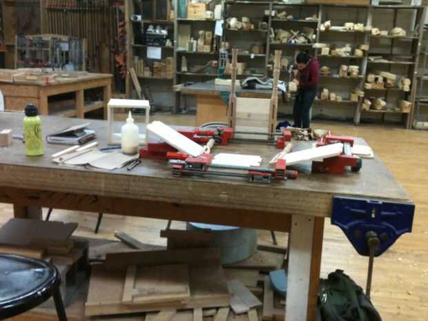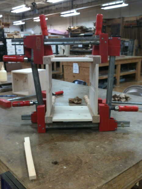 Decidimos pegar todas la juntas de una sola vez era mucho que ver. Has que las mortajas, espigas y las mejillas con el pegamento de la capa, encajen, encajan el resto de la caja, pinza todo y ajustar las pinzas para sacar Plaza si es necesario. Hacerlo para mortaja y 16 espigas fue una desalentadora para abordar a la vez.
