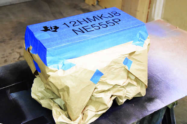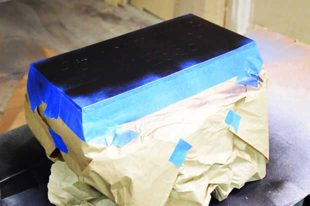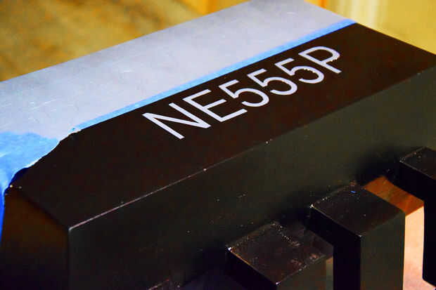 Cubrir el resto de las heces para protegerla de la pintura. Hacer una primera capa de pintura negra. Esto sellará los bordes de la pintura. Y si cualquier cosa iba a filtrarse bajo la pintura, la pintura negra que se filtrará. Espere hasta que la primera capa esté seca, luego pintar una capa ligera de imprimación gris. No quería una capa pesada vendida como mayoría ICs tengo ver que más de una impresión manchada de las letras que sólidamente impreso. Retire la cinta.