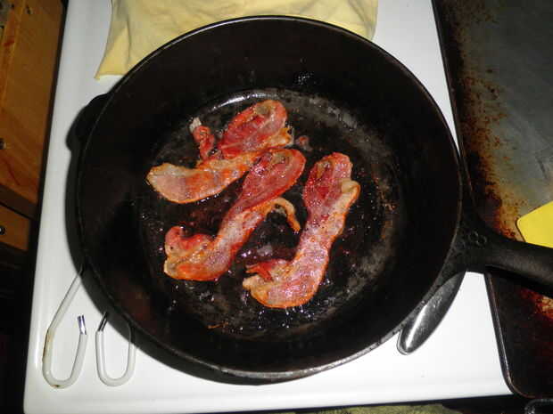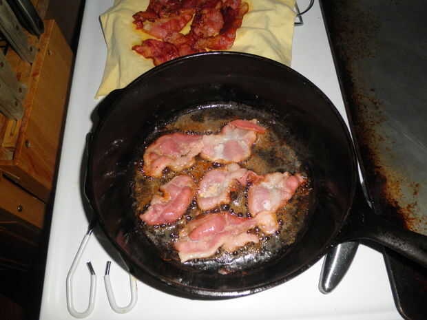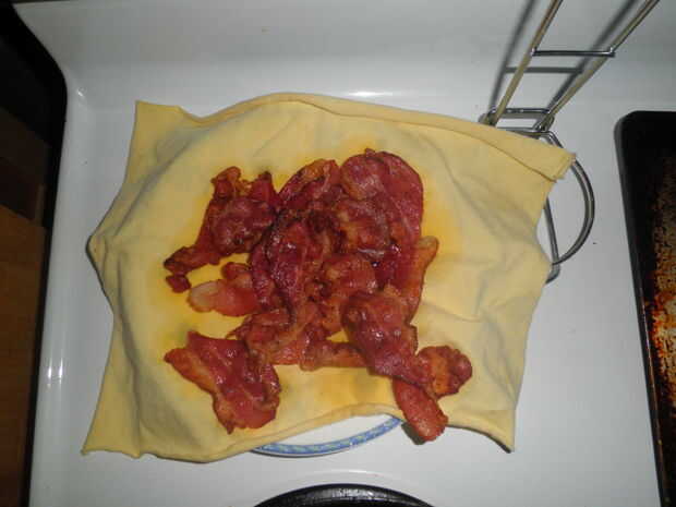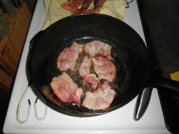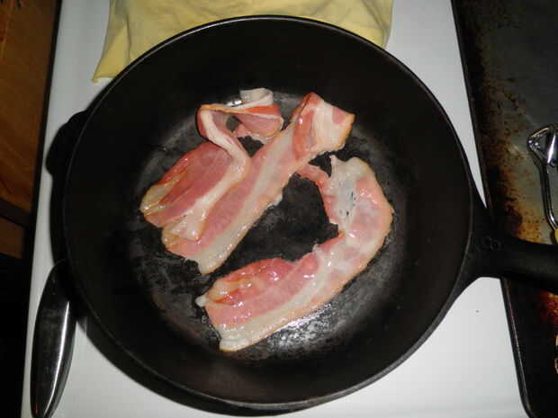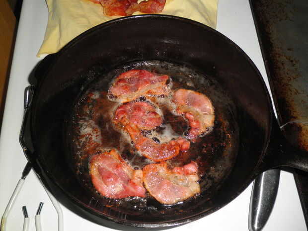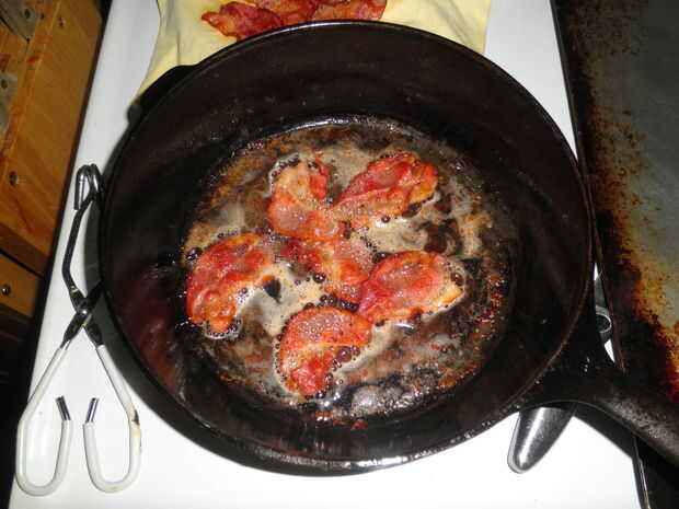 he utilizado una sartén de hierro fundido de 8 pulgadas para cocinar el tocino. Calienta la sartén alta med. Pongo en tres piezas a la vez. No sobrecargue la sartén. Deje que los alevines de tocino hasta que esté crujiente o a su preferencia. Mira mis fotos de antes y después para ver cómo cociné mi tocino. Algunas piezas me alojé más me ha gustado, pero estaban bien. Tiene una placa con una toalla de papel sobre ella para absorber la grasa extra.