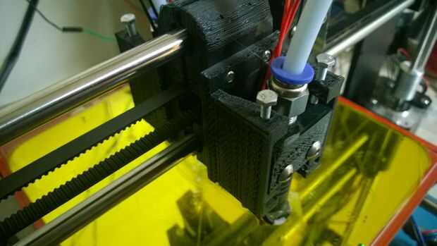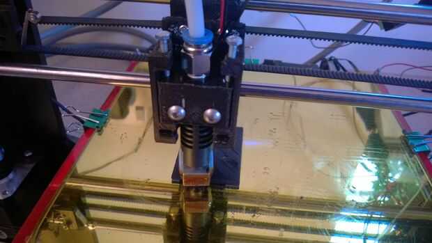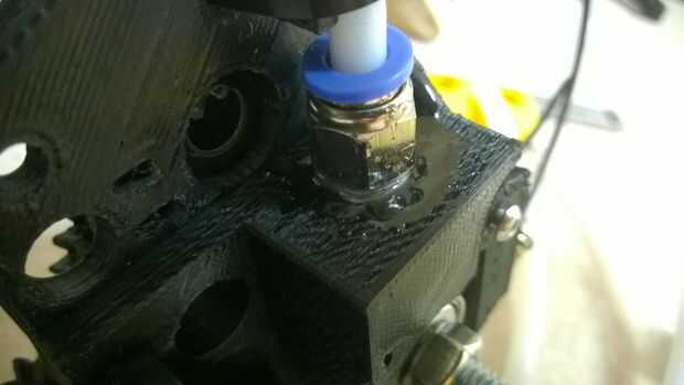A continuación, montar el sistema de tracción Bowden como sea necesario. Si utilizas el sistema que he mencionado anteriormente, necesitará poner juntos en una manera similar a Wade extrusora un estándar de Greg. (Como un aparte, cuando vino a unirse a un empuje a la extrusora de Bowden, sostuve la conexión en línea con el agujero necesario para conectar a y llena el espacio circundante con resina epoxi). Finalmente, conecte los calentadores, termistores y motores a las piezas apropiadas en su controlador y conecte el tubo PTFE para el sistema de impulsión, pero no la hotend todavía.