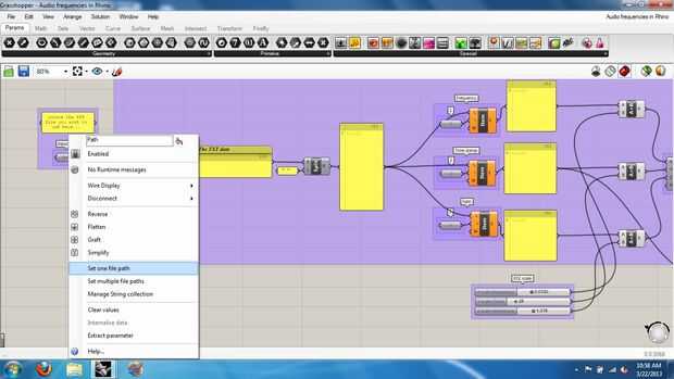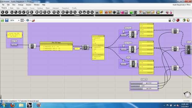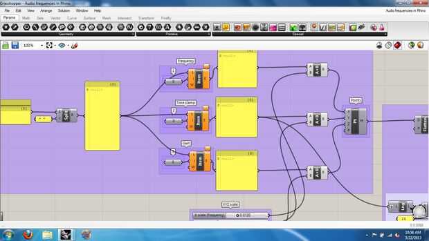Esta definición de Grasshopper básicamente toma los datos recogidos en frecuencia amplitud cuantificador y resta las palabras de cada línea de código, tan sólo los números permanece. Otra vez, el crédito va a Carlo Sammarco por esta increíble ayuda de saltamontes.