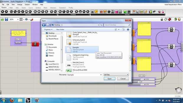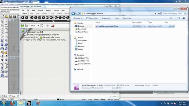 Abra Rhino y empezar a saltamontes. Abra la ubicación donde extrajo el archivo zip. (Para mí, era el escritorio) Abra el archivo de 'definición de saltamontes' y 'Frecuencias de Audio en Rhino' arrastre la ventana de saltamontes. (Imagen 1)