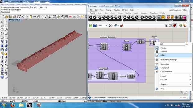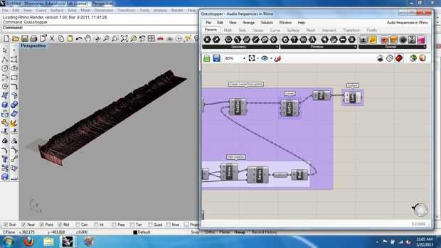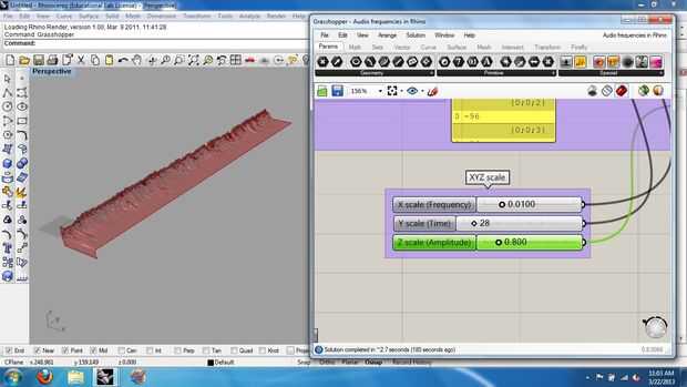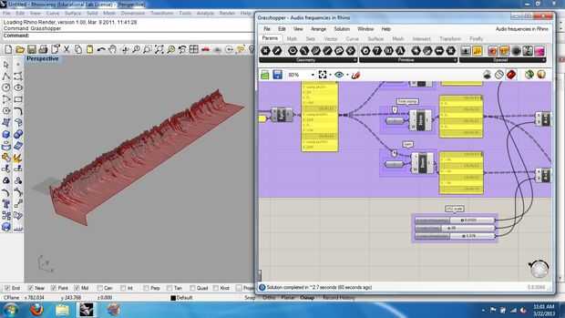 Ajustando el control deslizante en la parte inferior de la definición de Grasshopper, puede cambiar la altura (amplitud), longitud (tiempo) y anchura (frecuencia) de la forma tridimensional. (Imagen 2)